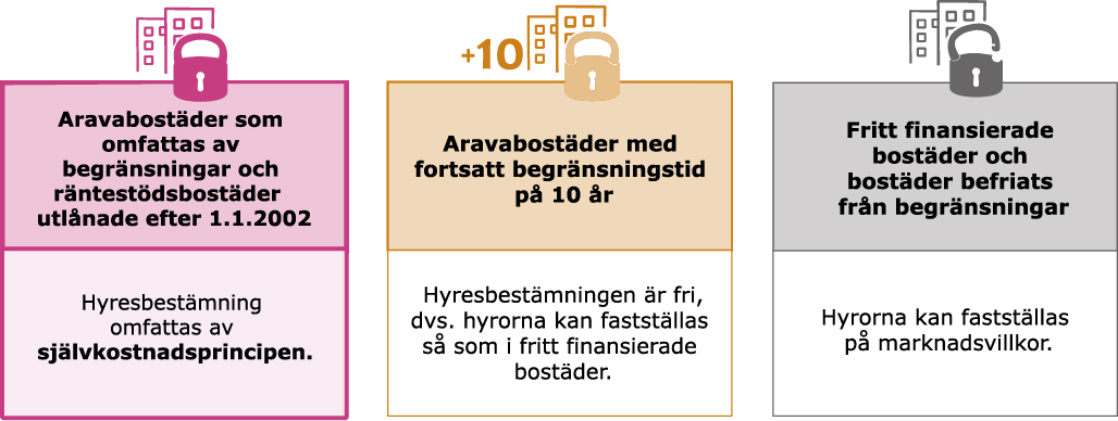 Hyresbestämningen för aravabostäder som omfattas av begränsningar och räntestödsbostäder som beviljats lån efter 1.1.2002 omfattas av självkostnadsprincipen. I aravabostäder med fortsatt begränsningstid på 10 år, fritt finansierade bostäder och bostäder som befriats från begränsningar är hyresbestämningen fri, dvs. hyrorna kan fastställas på marknadsvillkor.